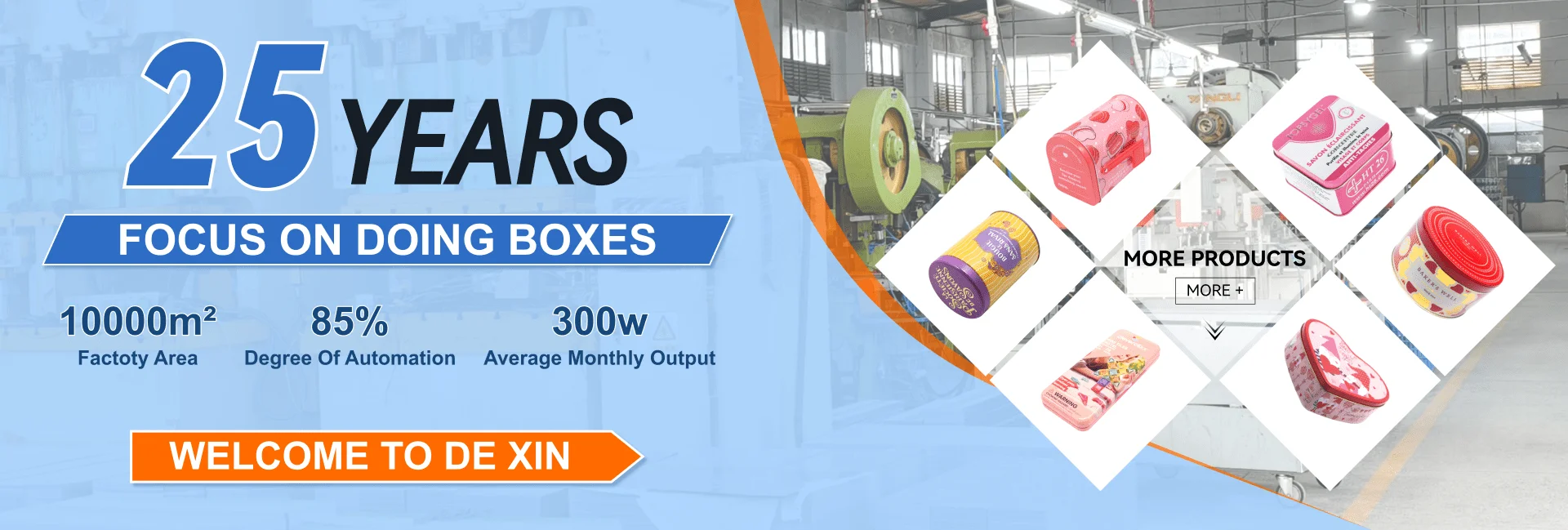 Established in 2003,Dexin is a Professional Manu-facturer and Exporter In the field of Metal Packaging for more than 17 years. We could supply allkinds of tin boxes for food and gift promotion,wehave more than 1000 sets tooling foryour choice.You can customized yourown design base on ouravailable size and shape ,which could help you tosave some time and tooling cost. All our team staffall have more than 8 year's experience in this fieldand our products have export to Germany,Japan,Spain and USA etc.Our Principal:High-Quality Products,Professional Service, Competitive Price,copyright Privacy. Welcome your visiting for further cooperation